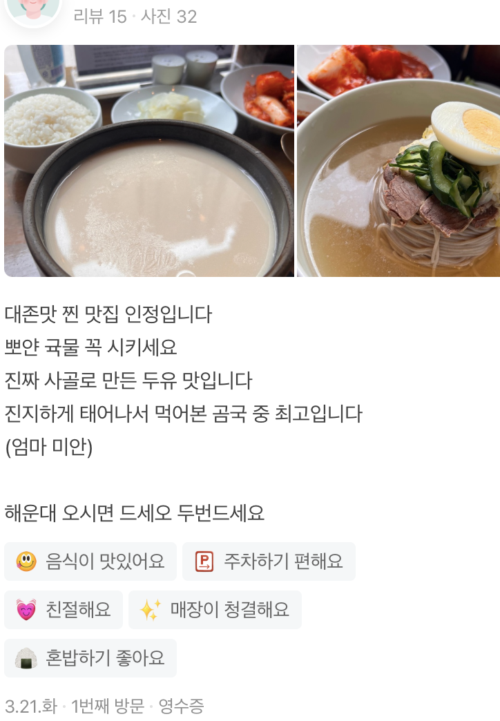 너무 감동적인 맛을 느낀 뒤, 네이버 후기에 후기를 남겼더니 5분도 채 안되서 리뷰를 1000회 넘게 돌파했다는 메세지가 뜨는 걸 보고 정말 찐맛집이구나 하고 생각했습니다. 진지하게 엄마가 만든 곰탕보다 백배는... 맛있었어.. 엄마 쏴리..