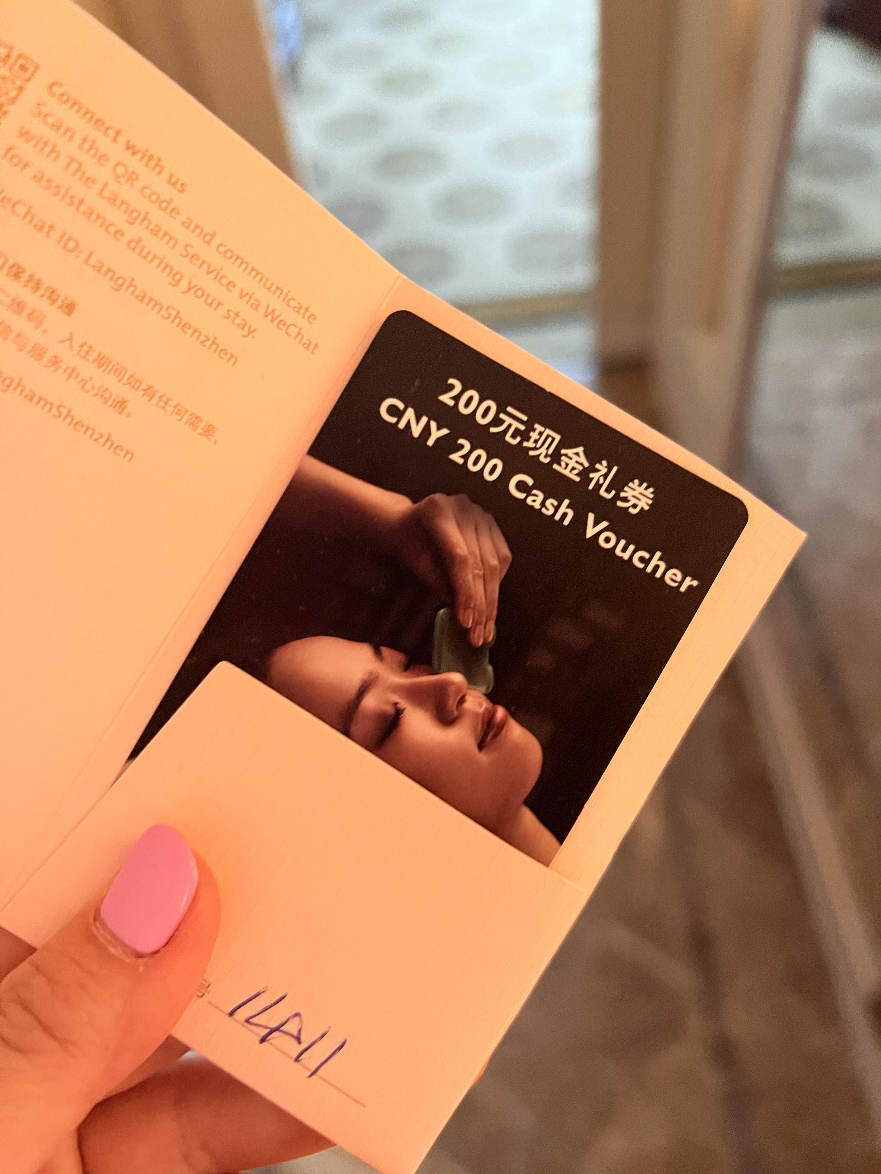 아메니티는 모두 호텔에서 제공하는 스파 브랜드 제품으로 제공됩니다. 촹이였나.. 이름을 까먹었어요. 호텔을 이용하는 이용객에게 이런 바우처도 줍니다. 인 룸 마사지 서비스가 650 정도였던 걸로 기억하는데 200 바우처가 있으면 350이라서 받을만한 서비스라고 생각했는데, 아쉽게도 너무 바빠서 받지 못해서 아쉬웠습니다. 다음에 가면 꼭 받아야지..