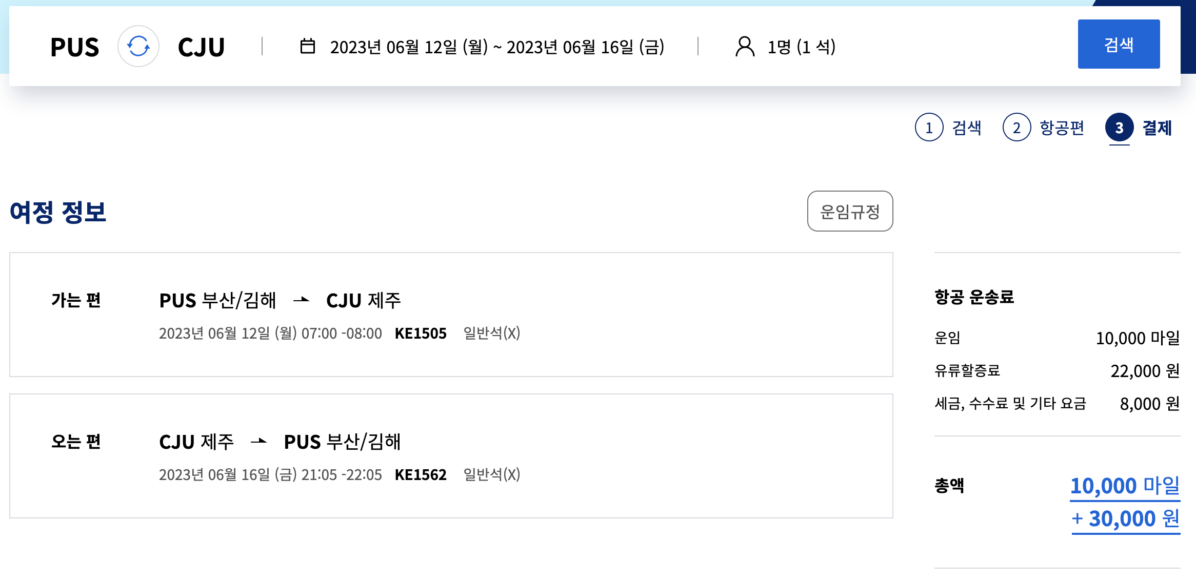 제주도의 경우 마일리지를 사용하면 3만 원으로 제주도 왕복표를 구매할 수 있습니다. 일반석으로 마일리지는 10000마일이 사용되었습니다. 마일리지로 표를 구매하는 경우, 유류할증료와 세금, 수수료 및 기타 요금만 내면 됩니다.