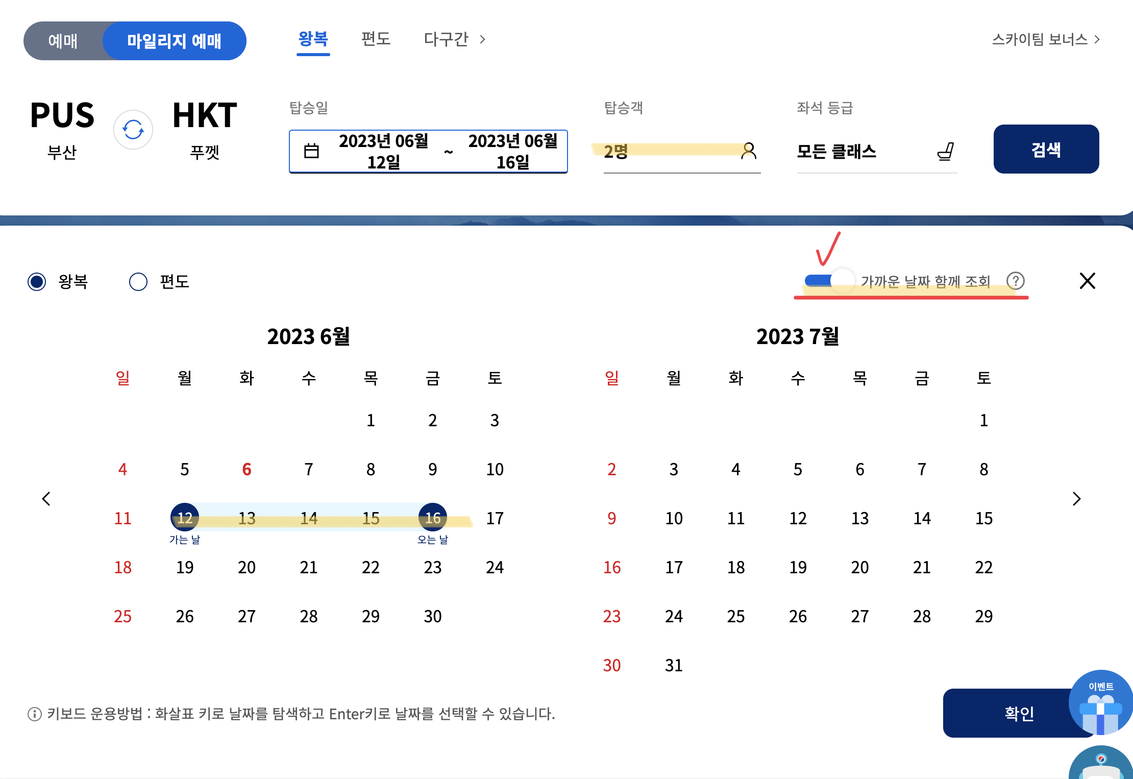 저는 특별한 날짜가 정해지지 않았을 때는 이렇게 가까운 날짜 함께 조회를 선택해서 해 주는 편입니다.