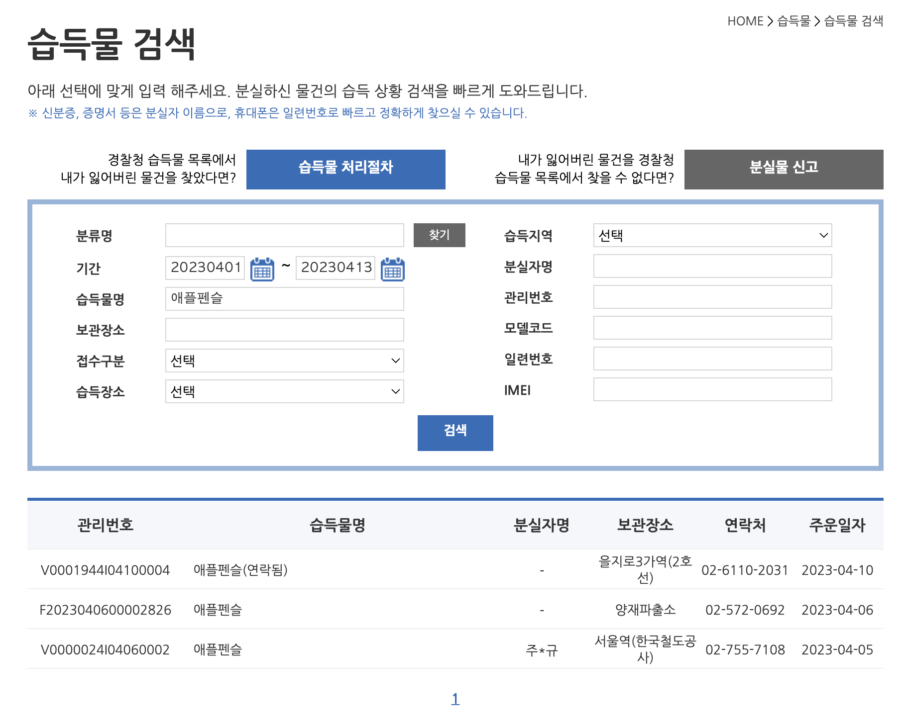 어쨌든, 여기서 찾지 못했다면 상단에 위치한 분실물 신고를 통해서 유실물 등록을 할 수 있습니다. 저는 애플펜슬이 업무 상 꼭 필요하기 때문에, 분실한 사실을 안 후에, 신고하고 바로 새로 구입하였습니다. 하지만 이런 과정을 통해서 분실물을 찾아내면, 택배로 물건을 수령하거나, 공항에서 물건을 수령하는 것이 가능하다고 합니다.