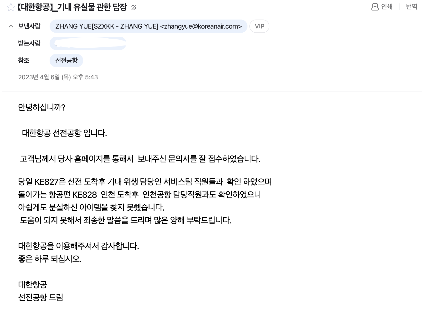 대한항공 유실물 찾기