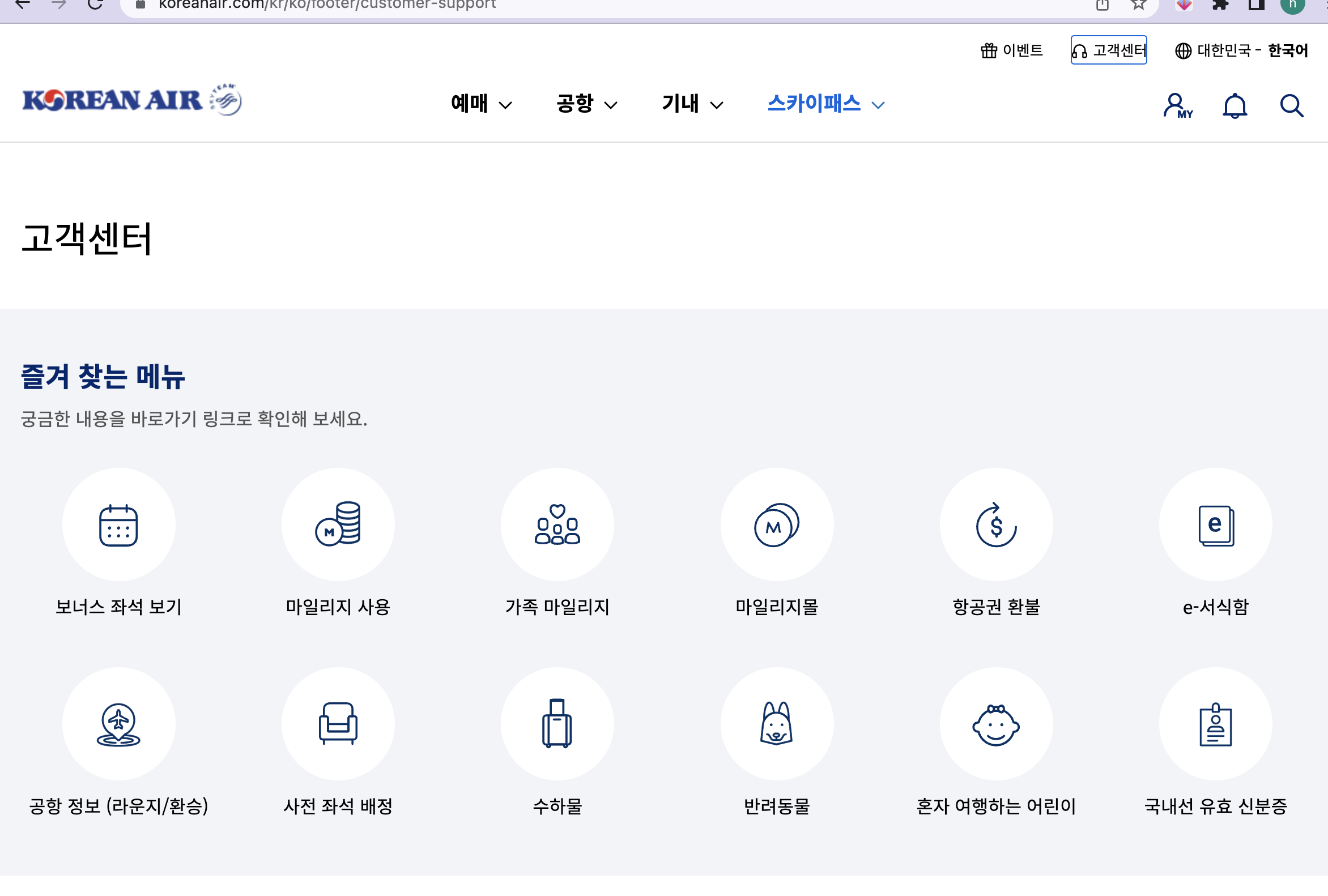일단, 애플펜슬을 분실한 사실을 발견한 저는 바로 대한항공 사이트에 접속했습니다. 홈페이지 상단에 고객센터로 들어 가 주세요. 윗 쪽에서는 유실물 관련 메뉴를 찾을 수 없습니다.