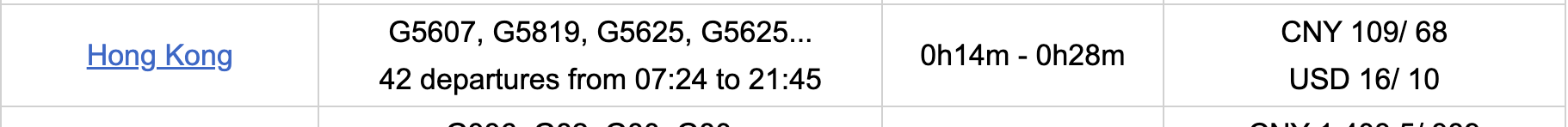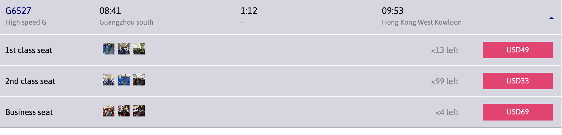 심천에서 이동 시에 로후역으로 가면 고속 전철도 이용이 가능합니다. 심천에서 타는 것은 큰 메리트가 없는 것 같긴 합니다만, 광저우에서 이용시에는 고속전철이 굉장히 편하고 빠른 옵션입니다. 2시간이 채 걸리지 않고, 홍콩 웨스트 카오룽 West Kowloon 역까지 한번에 갈 수 있습니다. 아래는 광저우에서 홍콩 웨스트 카오룬 역까지 가는 고속 기차 가격과 시간, 예약가능한 사이트 입니다.