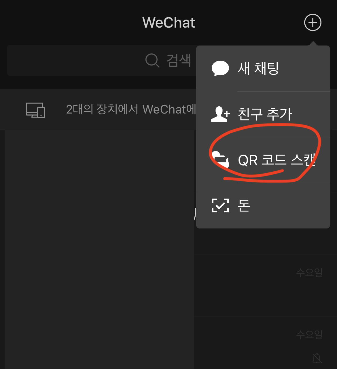 위챗을 켜서 오른쪽 상단에 +를 눌러준 다음 QR 코드 스캔을 눌러 줍니다.