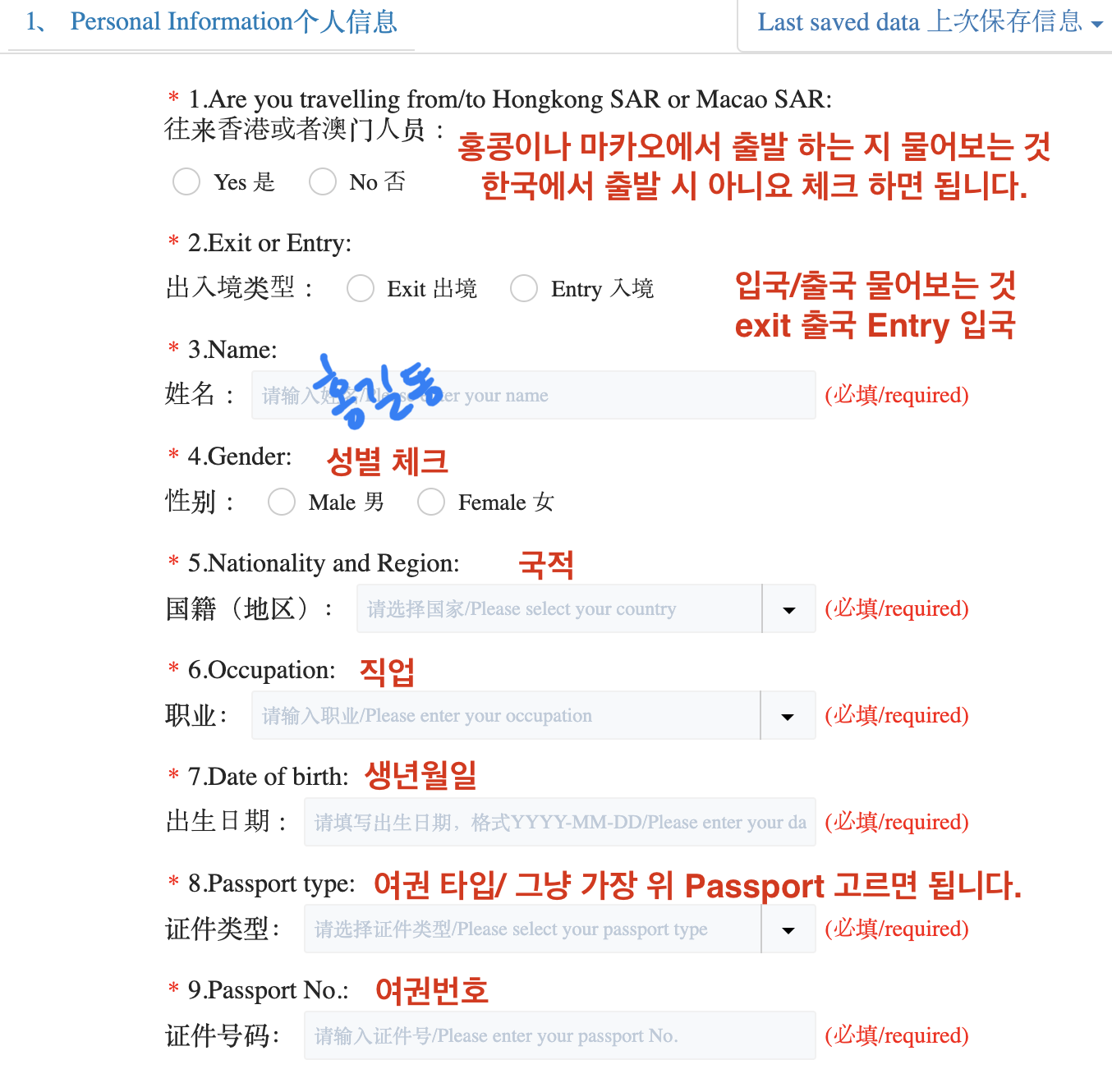다음은 입출국 정보를 입력합니다. 저는 입국 시에 귀찮아서 사실 중국 연락처를 적지 않았습니다. 비자 수속 할 때 물어보긴 했지만, 중국어를 못 알아듣는 척을 했더니, 그냥 no no라고 하시고 보내주셨습니다. 굳이 적지 않아도 될 것 같습니다.