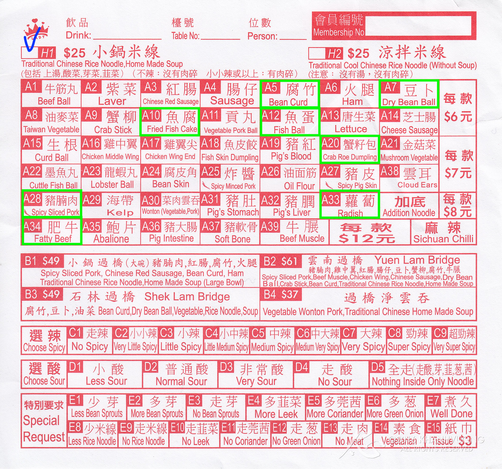 먼저 제가 추천하는 메뉴는 형광색 네모로 표시해 두었습니다. A20은 피쉬볼에 고소한 게알이 들어있다고 되어있지만, 진짜 게알은 아닐테고 치즈 같은 맛이 나는 속이 들어있습니다. 강추하는 메뉴입니다.