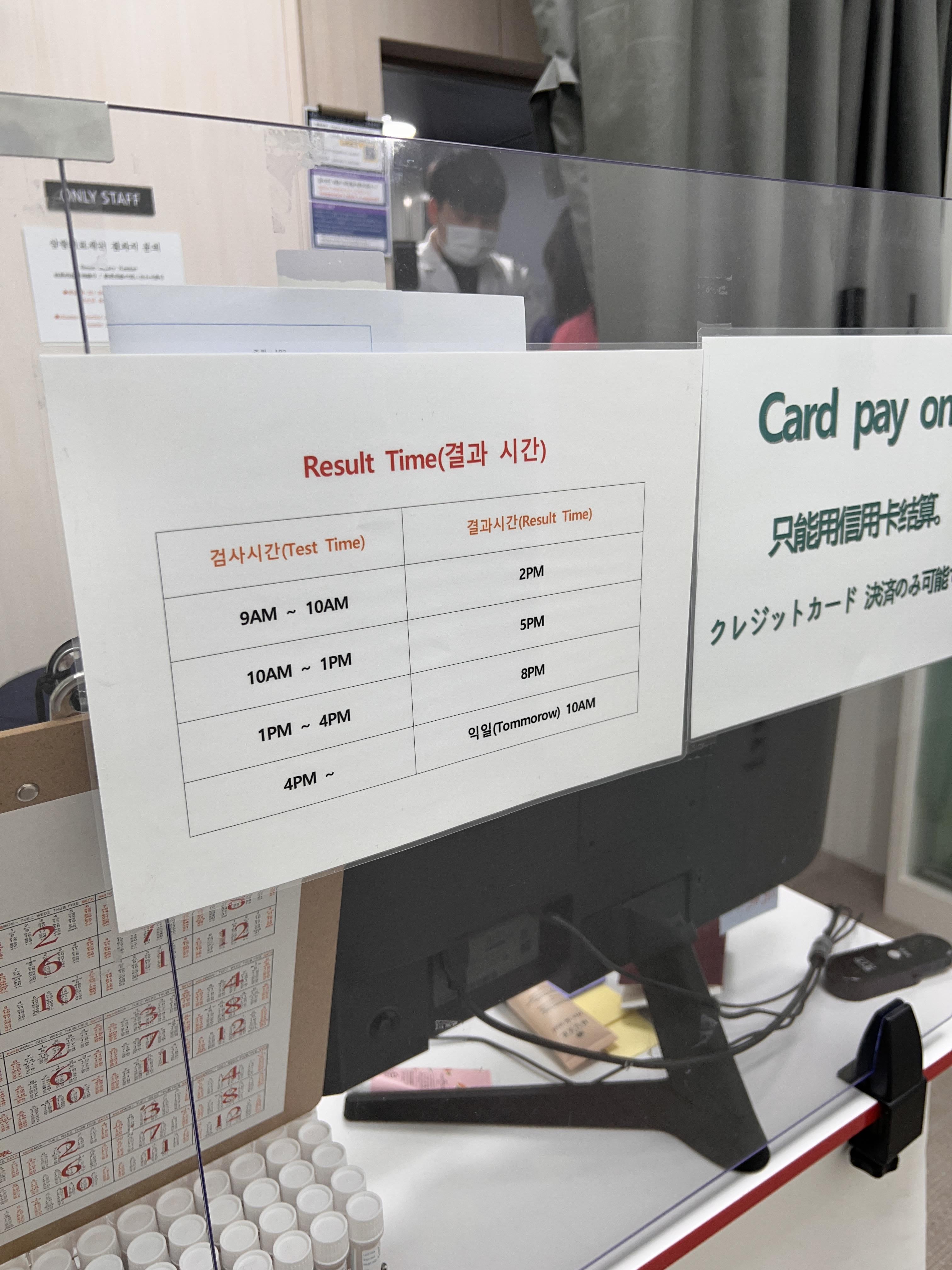 또한 요즘은 당일 검사 발급이 빠르게 되는 편이니 걱정할 것 없다. 공항에 좀 일찍 가서 버틸 수 있다면 공항에서도 검사가 가능. 공항 마다도 다르고, 사람이 많이 몰리냐 아니냐에 따라서도 결과 나오는 속도가 다른 듯하다. 하지만 보통 3-4시간 걸린다고 생각하면 OK.